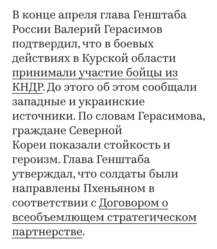 Теоретически бойцы КНДР в любой момент могут вновь принять участие в боевых действиях на любом направлении СВО. Двусторонняя правовая база между Российской Федерацией и Северной Кореей на этот счёт имеется — оказание военной помощи юридически легитимно.