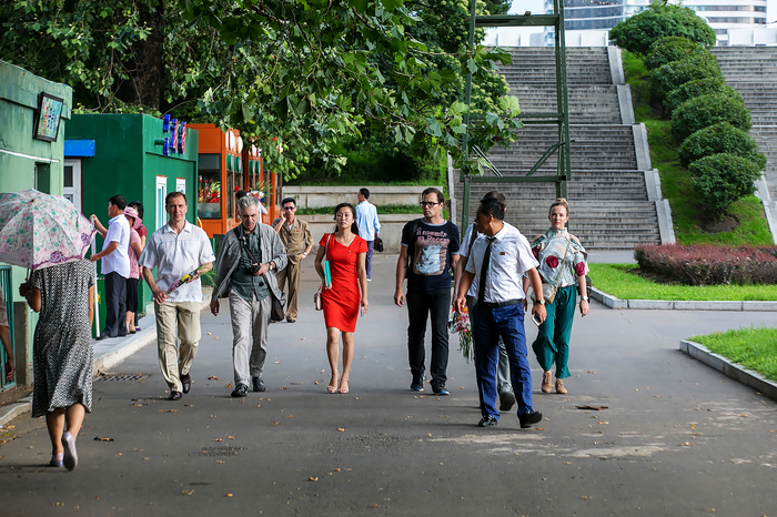 Долго находится у статуй нельзя - образуется очередь из желающих возложить и поклониться. После нас к ногам великих вождей идет группа северокорейцев. Кстати, в Северной Корее не принято называть её Северной - просто Кореей, ибо они считают, что юг временно оккупирован.