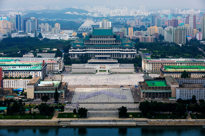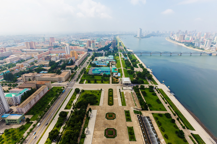Возвышающийся над рекой Тэдон 170-метровый Монумент идей чучхе оказался наиболее удачным местом для фотографирования, где мне довелось побывать в Пхеньяне. Единственная причина - обзорная площадка наверху монумента. Квадрокоптер в страну провозить запрещено, поэтому приходится довольствоваться высотными зданиями, а это гостиница "Рёгон", где мы жили, и этот самый Монумент.