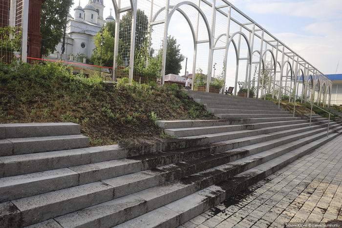 Но, как это часто у нас бывает, не много подкачала реализация. Не сделали ограничители для грунта и после дождя землю вымывает на ступеньки сквера.