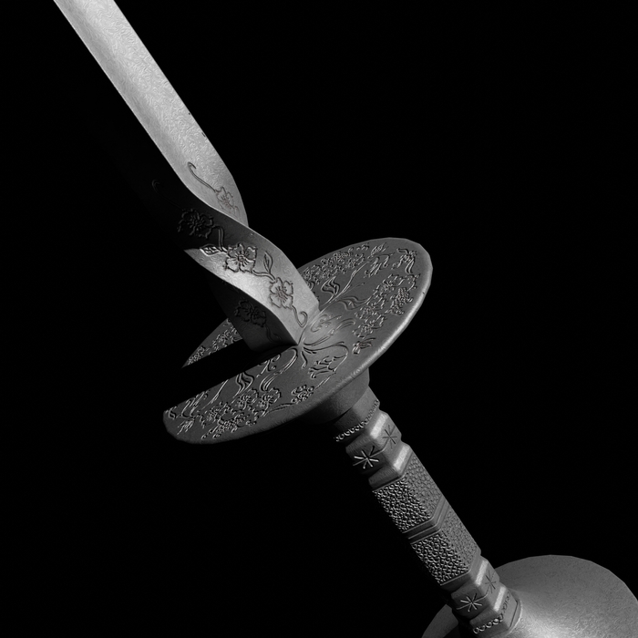 Клинок линзовидного сечения, с тремя долами. В центре клинка - клеймо мастера. Обратите внимание на парные отверстия в гарде и навершии. Возможно, предназначались для предохранения пальцев посредством установки цепочки.