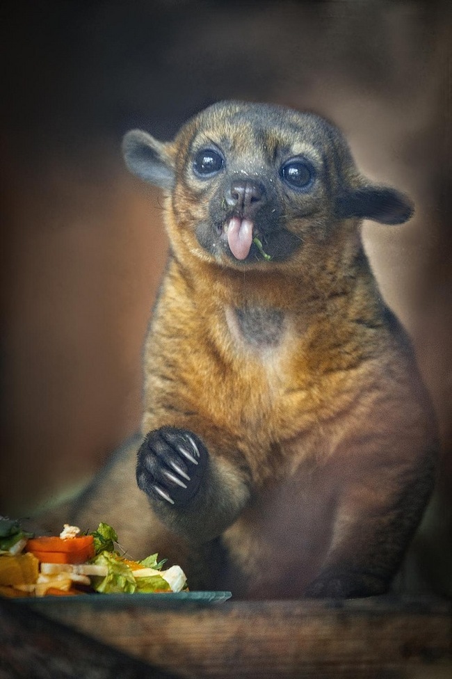 Кинкажу лоялен к человеку и легко приручается. У нас, конечно, редкость, но в Южной Америке часто живёт с людьми в качестве домашнего любимца.