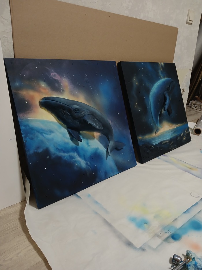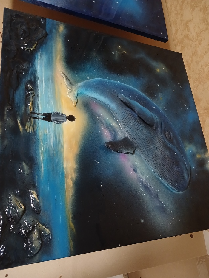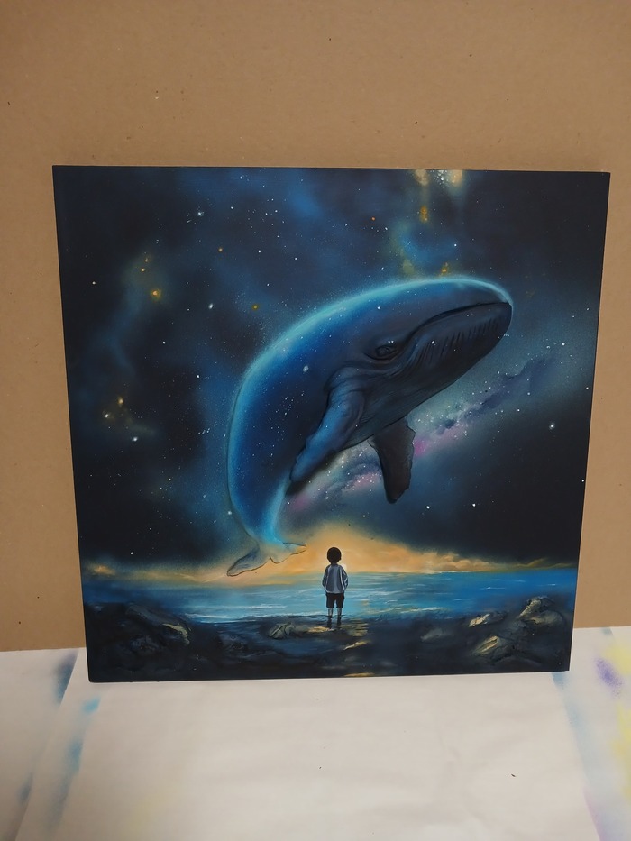 Эта картина олицетворение бесконечного поиска и стремления к неизведанному. Кит, парящий в космическом пространстве, символизирует силу природы, её величие и загадочность. Маленький человек, стоящий на берегу, олицетворяет человечество, которое, несмотря на свои размеры, стремится понять и постичь бескрайние просторы Вселенной. Картина напоминает о том, что даже самые маленькие из нас могут мечтать о великом и стремиться к звёздам.