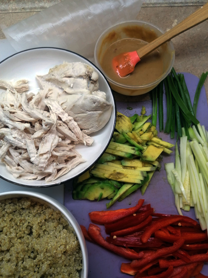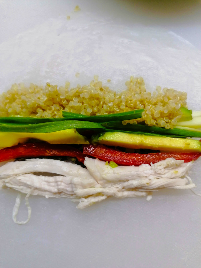 Отварил куриную грудку 15 мин и сварил киноа .. сделал соус сатай ..смешал ингредиенты размешал потом добавил воды 3ст ложки и еще раз тщательно перемешал ..затем нарезал соломкой перец,кабачок,авокадо,лук зеленый порезал пополам в длину ну а куриную грудку просто руками по волокнам нетолстыми кусками порвал ... далее дело техники ..рисовую бумагу в теплую воду на 5 секунд затем собираем ролл ..мята ,перц ,кабачок,авокадо,зеленый лук ,киноа и куриная грудка сверху полил соком лайма .. и аккуратно свернул ..