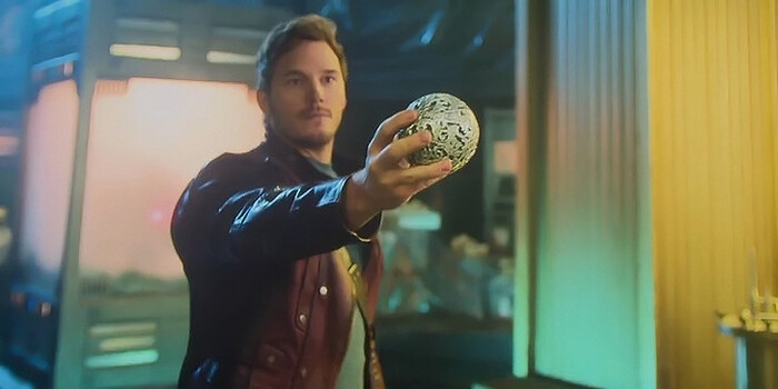 Звездный Лорд достает бесценный и невероятно могучий Камень Бесконечности, чтобы показать его коллекционеру. И роняет его, после чего с невозмутимым, а потому глупым видом подбирает камень с пола. Криворукий актер Крис Пратт и в самом деле обронил артефакт. Что, кстати, доказало всем на съемочной площадке, что он прирожденный неудачник Звездный Лорд. Конечно же сцену оставили в финальной версии кинокартины!