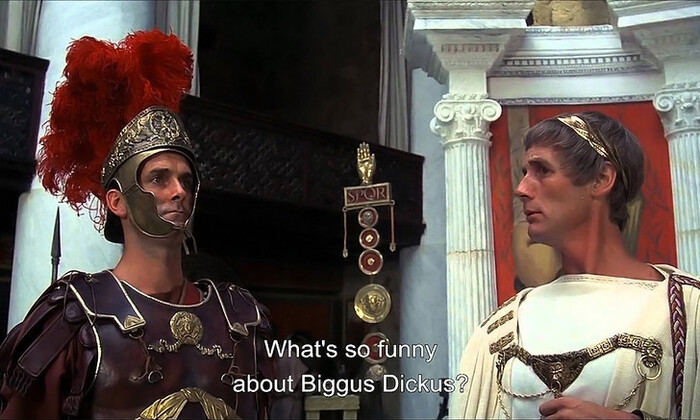 Скотина Майкл Пэйлин был слишком, слишком смешной; римляне через силу подавляли в себе смех и кривили рожи, что и породило знаменитую сцену в привычном нам (еще более смешном, чем задумывалось) виде. Сейчас бы все это наверняка исправили на компьютере при монтаже.