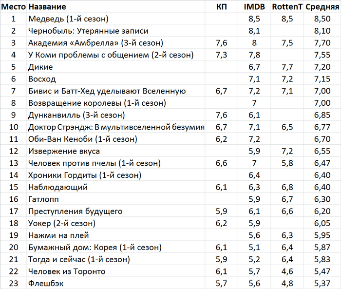 Таблица с рейтингами Кинопоиска, IMDB и Rottentomatoes.