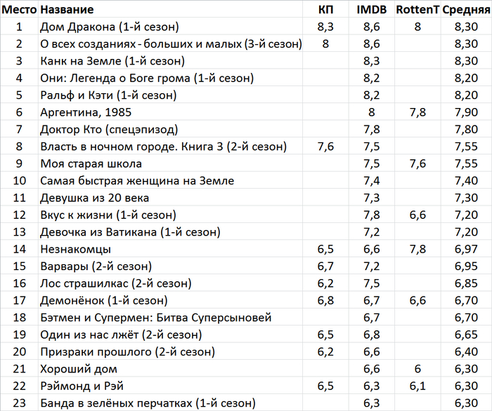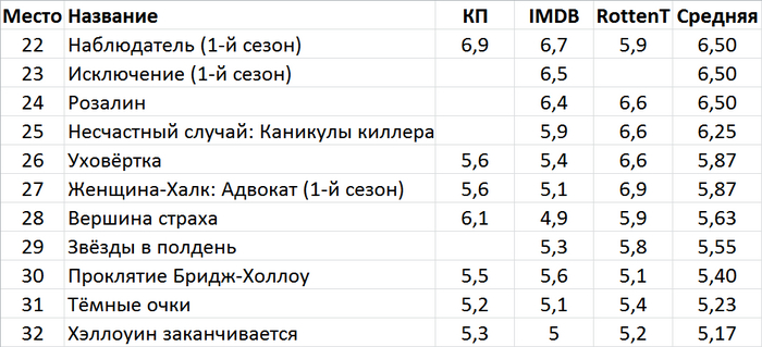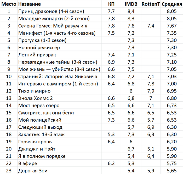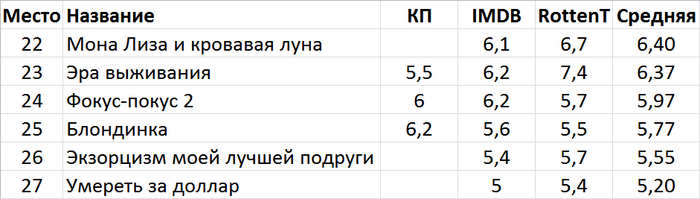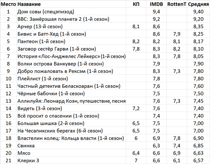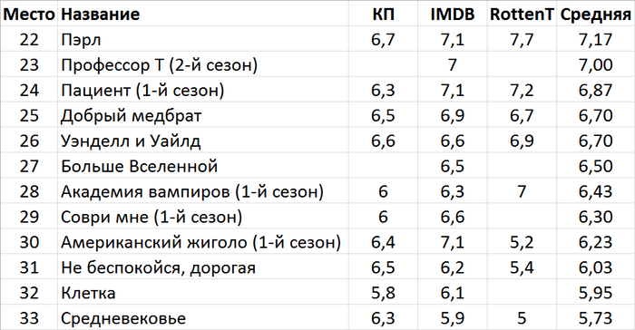 Таблица с рейтингами Кинопоиска, IMDB и Rottentomatoes.