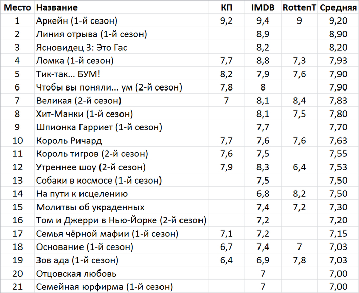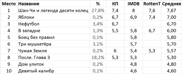 Таблица с рейтингами Кинопоиска, IMDB и Rottentomatoes.
