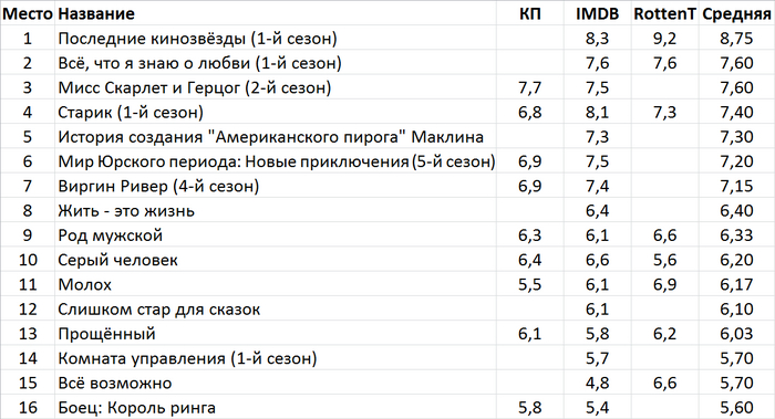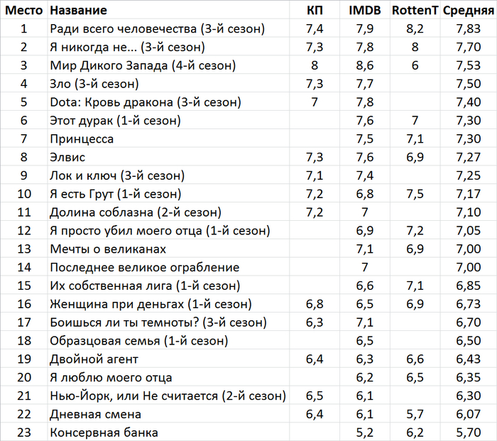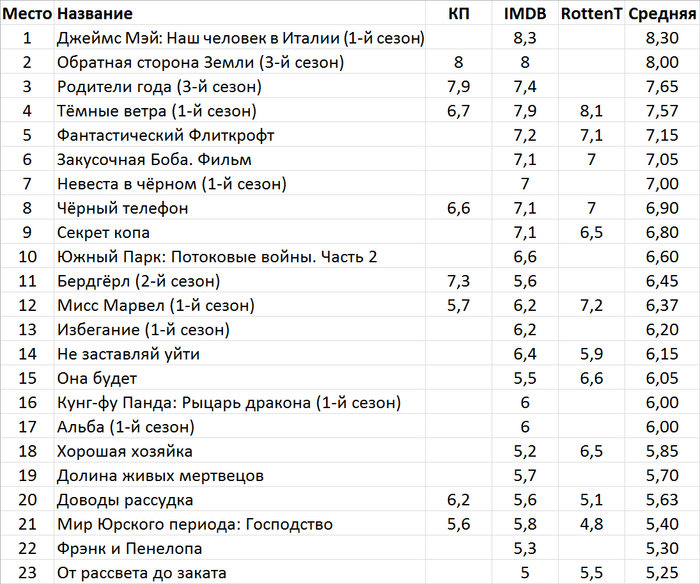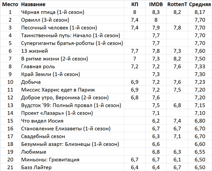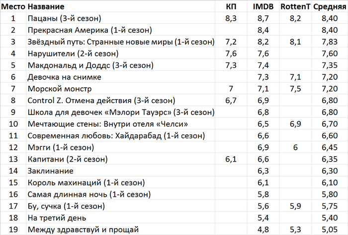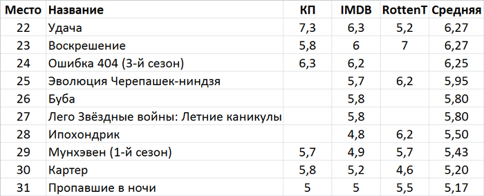 Таблица с рейтингами Кинопоиска, IMDB и Rottentomatoes.