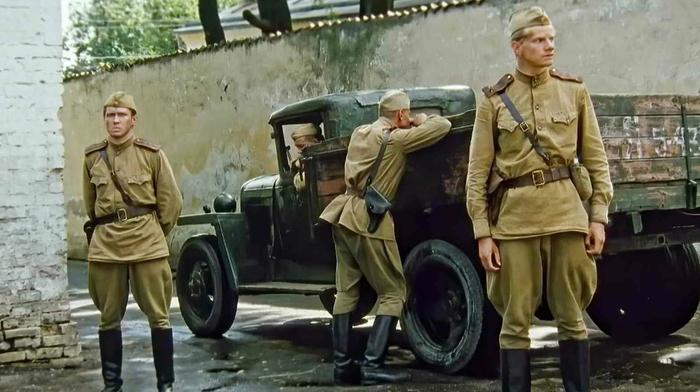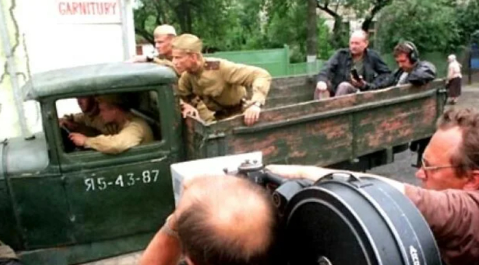 Офицеры даже жалели своих солдат, мол они снимаются в невыносимых условиях - на жаре по вреди проселочной дороги, по которой то и дело ездят автомобили, окатывающие солдат клубами пыли.