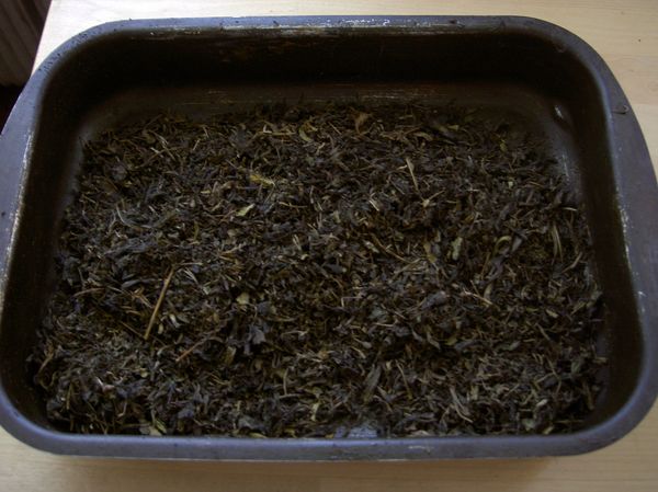 Вот так выглядит масса из листьев, после двух дней ферментации – листья пожухли, приобрели бурый оттенок, да и запах стал специфичным – не гнилым, но схожим с другими чаями, прошедшими процесс ферментации.