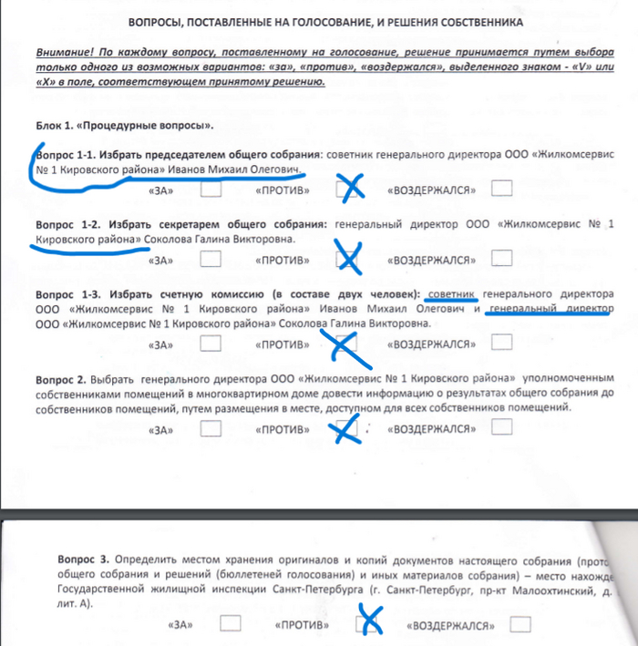 Розочка на торте - Избрать председателем общего собрания: советника генерального директора ООО ЖКС №1 Кировского района» Иванова Михаила Олеговича и секретарем – гендира ЖКС. Это как вообще? Закон говорит, что так нельзя делать и должны быть другие лица (не заинтересованные в грядущем обмане). То есть они сами придумали новую схему, сами нарисуют наши голоса в протоколах, а мы, жители, снова терпи!