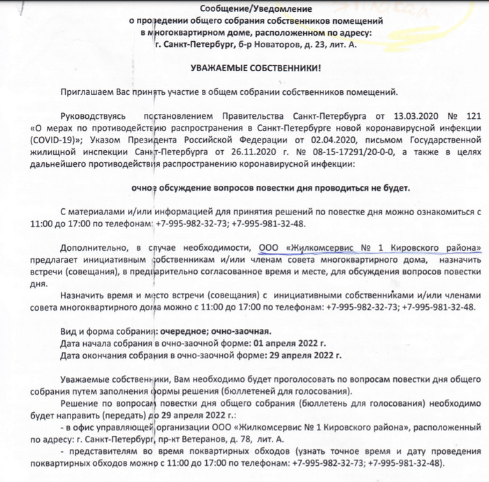 "Хочу предупредить соседей и жителей, кого обслуживает ЖКС №1 в Кировском районе! Кажется, грядет очередной обман! Голосуйте против, не молчите.Нашли в ящике уведомление о грядущем собрании (оно заочное) и ахнули с мужем. Полезли выяснять.