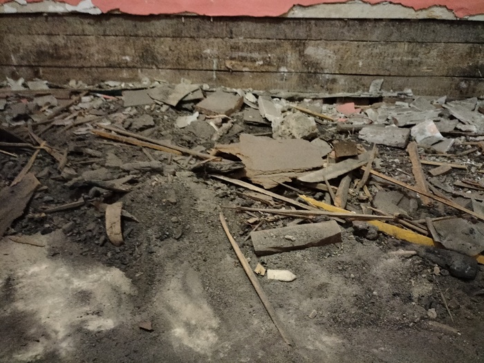 Чего это, блять, такое? Что это за гашня такая? Откуда на 4 этаже столько мусора? Зачем его укладывали ровным слоем под лаги? На что был рассчет? У меня в нынешней квартире, а это тоже хрущевка на секундочку, был какой-то утеплитель под лагами, похожий на толстое ДВП и все. Тут то что произошло? Как говорит моя соседка, очень милая бабуля, ебанёсся просто.