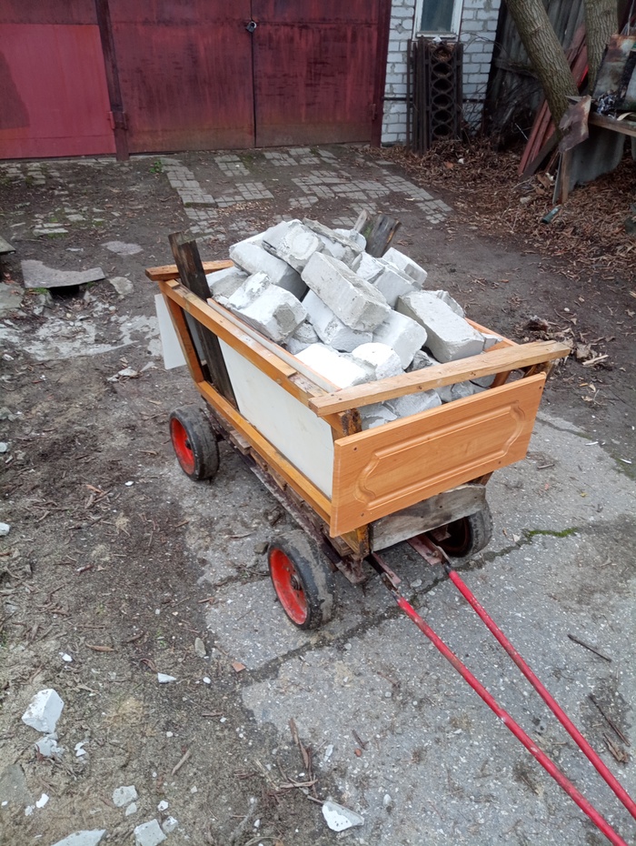 Тележку не отдам. С каждым днём число кирпича увеличивается. Кирпич складываю более-менее ровно, чтобы не мешал работать дальше
