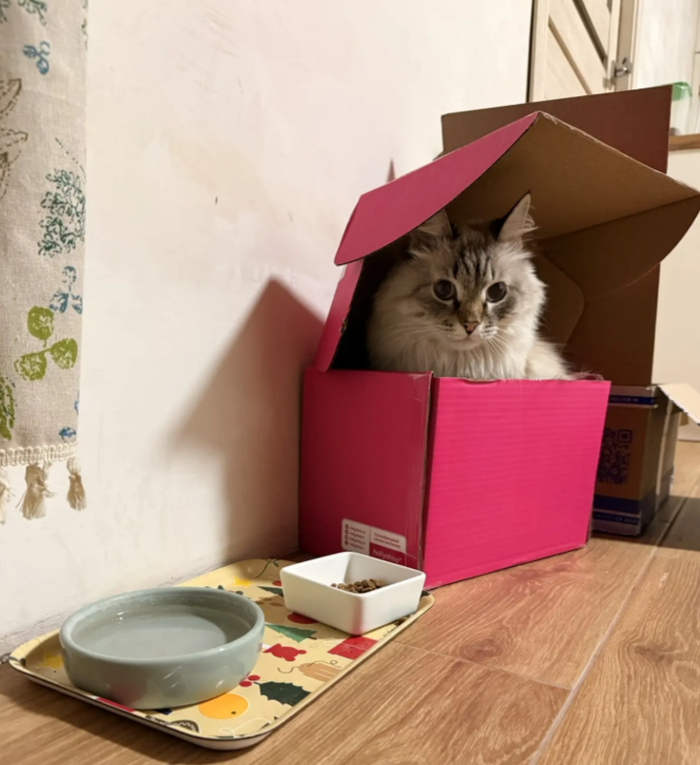 В коробке была еще одна коробка, у кота аж глаза засверкали, от счастья!