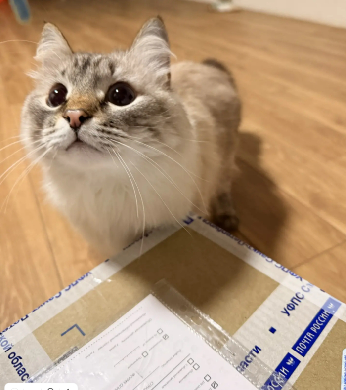 Вечер, захожу домой, котоинспекция меня встречает и с прищуром смотрит на коробку в моих руках. Открывать посылку было решено на кухне. По пути был вызволен сын из логово-комнаты. И вот мы в троем сидя на полу кухни, с ножом в моих руках приготовились резать ... резать скотч на посылке!