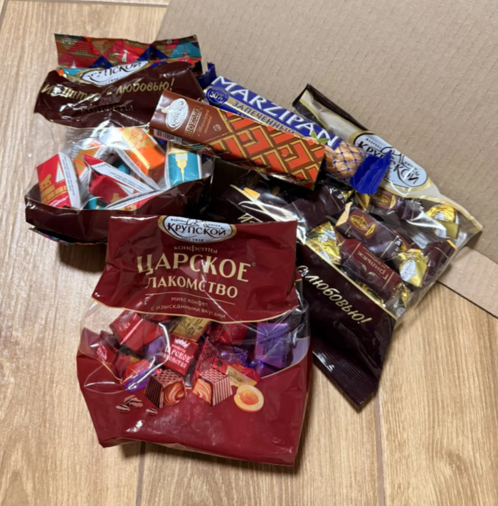Дальше были извлечены сладости, производства "фабрика имени Крупской" это те самые конфеты из детства, зефир и чай (не попали на фото)! Маленькое отступление: в Санкт-Петербурге у меня живут родной брат и двоюродная сестра, я стабильно бываю в этом городе раз в год точно. Питер я влюбилась с первой поездки, и он меня приятно удивляет каждую мою поездку! И я всегда привожу конфеты домой именно в таких же упаковках! У нас в магазинах на развес продаются такие же, но мы семьей проводили эксперимент, они отличаются! Из Питера они вкуснее! (может это самообман, но мне все равно, мне так хочется!).