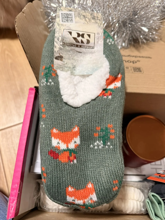 Дальше на очереди носочки с сурикатами и тапочки-следочки с лисичками! Носки забрал себе сын! А тапочки буду носить я летом, так как в доме пол из керамогранита и именно летом он бывает холодным! Спасибо за такую заботу Дедушка Мороз!