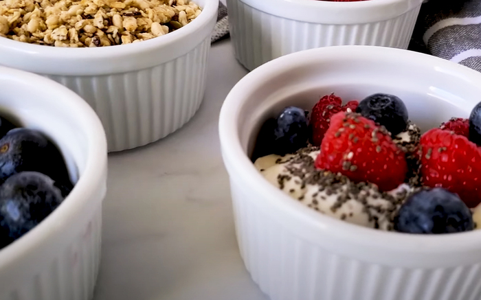 Попробуйте добавить свои любимые джемы, специи и экстракты или добавить кленовый сироп или мед. Йогурты со вкусом ванили, корицы, лимона и кофе очень вкусны. Жареные фрукты, такие как персики или ягоды, создают вкусный волновой эффект. Гранола, тертый кокос, семена чиа и орехи также хорошо подходят. Возможности безграничны! У меня в холодильнике всегда есть два или три ароматизированных йогурта.