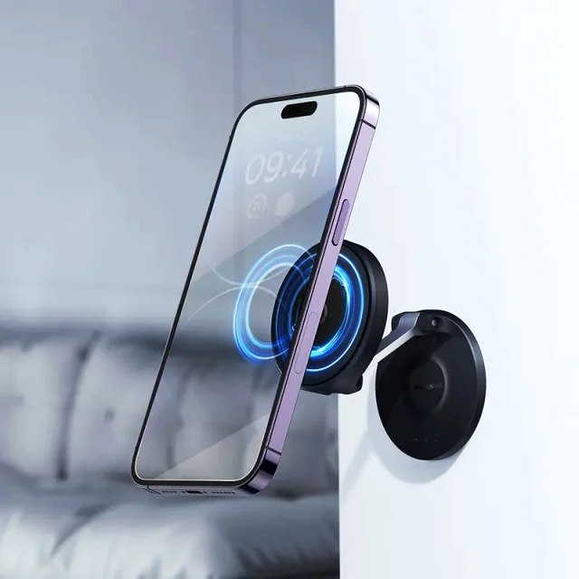 Аксессуар от Baseus удерживает смартфон с помощью мощного магнита и приклеивается к любой поверхности. Держатель вращается на 180 градусов и позволяет изменять наклон устройства.