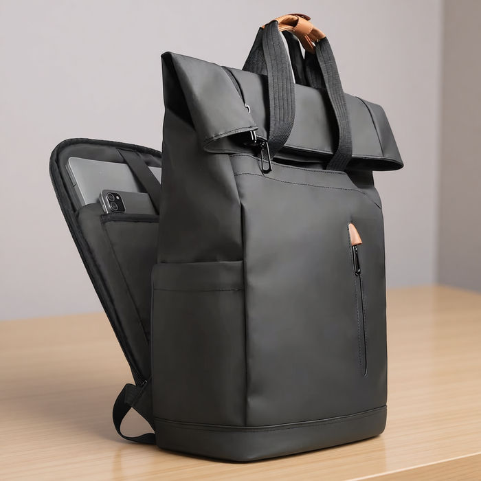 На передней панели встроен USB-порт — подключите пауэрбанк в боковой карман, и сможете заряжать телефон на ходу. Спинка сделана из плотной ткани с рёбрами жёсткости, поэтому даже в переполненном метро рюкзак не сплющится и не помнёт вещи.