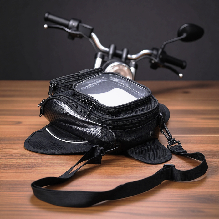 Сумка на бак мотоцикла крепится магнитами к топливному баку и снимается за секунду, когда нужно взять её с собой. Корпус из 1680D нейлона отталкивает воду и грязь, так что вещи остаются сухими даже после проезда под дождём или брызг от луж. Три отделения помогают распределить мелочи — ключи, документы, телефон — каждое на своё место.