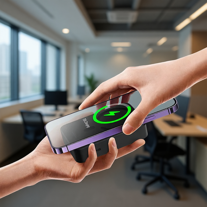 Портативный аккумулятор с магнитной зарядкой вмещает 10 000 мАч и совместим со смартфонами и планшетами. Беспроводная зарядка работает на мощности 15 Вт, проводная — на 20 Вт, так что можно заряжать гаджеты в зависимости от ситуации. Магниты в корпусе держат телефон без скольжения, даже если положить аккумулятор на бок или использовать во время зарядки.