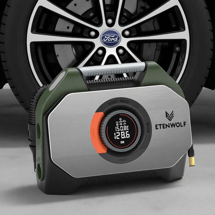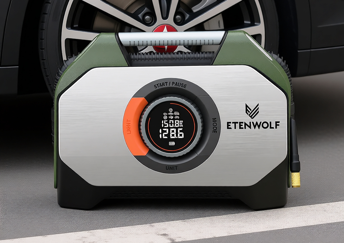 Портативный насос ETENWOLF S7 — это два полезных устройства в одном: надёжный компрессор для шин и мощный внешний аккумулятор для смартфона. Встроенный манометр показывает давление в реальном времени, а если задать нужное значение, насос сам отключится, как только достигнет цели — никакого перекачивания или недокачки.