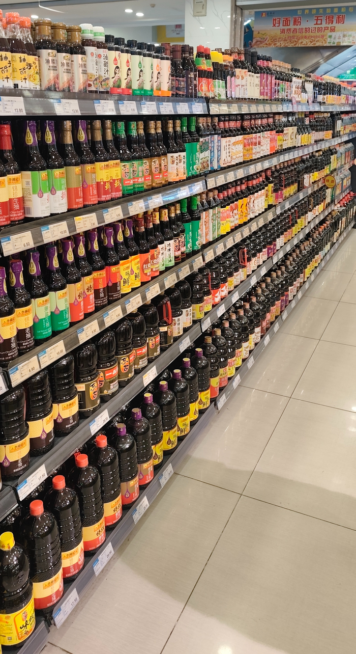 Соевого соуса несколько стеллажей. Нам разница неочевидна, но она есть. Молодой, зрелый, более соленый, менее, куча разновидностей для готовки.