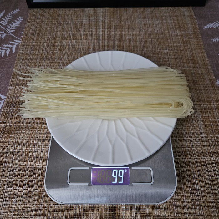 Теперь изучим каждый пакет и его содержимое подробнее. Начинаем с лапши. Рисовая, средней толщины. Масса 100 граммов.