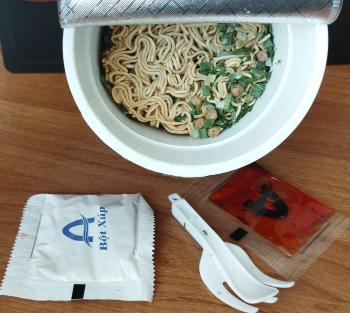 Внутри множество ярких разноцветных пакетов с добавками. С трудом разместил в кадре. Но при этом даже вилочку не положили.