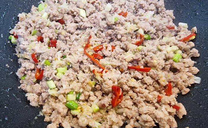 Когда фарш поменяет цвет и влага почти выпарится, раздвигаем центр вока и кладём имбирь-чеснок, острый перчик и белую часть лука. Как только пойдёт запах, перемешиваем сначала всё между собой, а потом всё с фаршем. Продолжаем жарить
