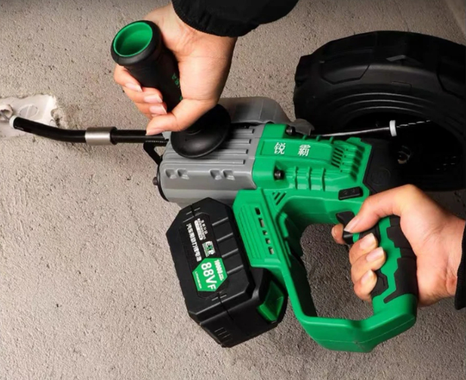 Инструмент для протяжки кабеля предназначен для прокладки проводов через стены, потолки и скрытые каналы. Конструкция напоминает компактный перфоратор и оснащена основной рукояткой с кнопкой запуска, переключателем реверса и дополнительной съёмной рукояткой для удержания.