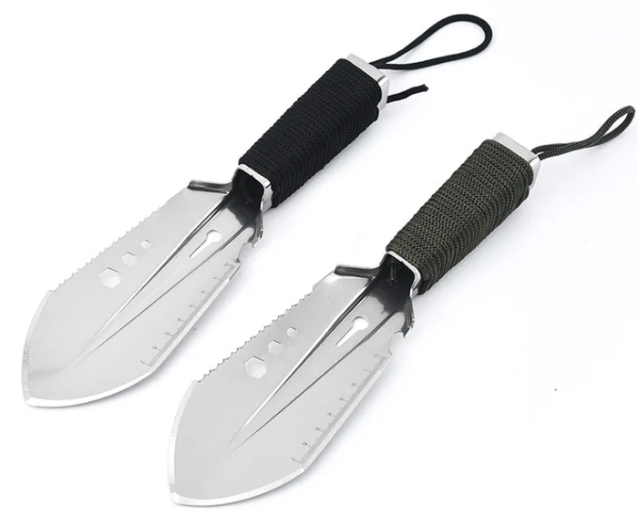 Многофункциональная лопатка создана как универсальный инструмент для туристических, строительных и бытовых задач. На рабочем полотне расположены дополнительные элементы — пила, гвоздодёр, отвертка, ключи разных диаметров, линейка и открывалка. Такая компоновка превращает лопатку в настоящий многоинструмент, способный заменить целый набор походных принадлежностей.