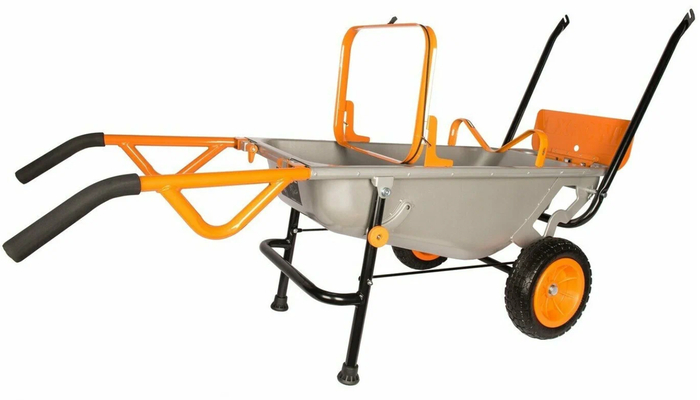 Рама изготовлена из прочной стали, устойчива к коррозии и выдерживает ежедневную эксплуатацию на улице. При весе около 19 кг тележка способна перевозить до 136 кг, а объём кузова достигает 80 литров, что делает её универсальным инструментом для строительных, садовых и бытовых задач.