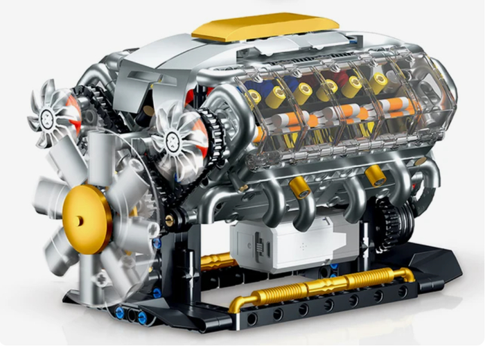 Конструктор воспроизводит сложную механику восьмицилиндрового двигателя в виде детальной сборной модели. Поршни, шатуны, коленвал и прочие элементы не просто фиксируются на своих местах, а приходят в движение благодаря встроенному электроприводу.