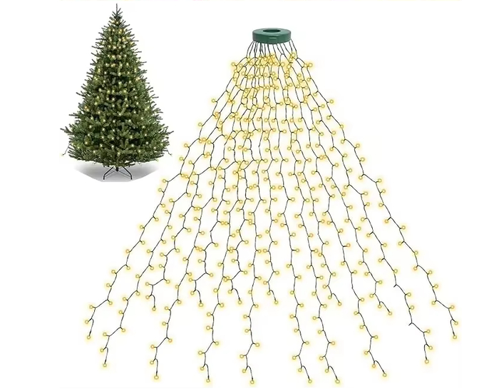 Гирлянда формирует эффект водопада, который мягко спускается вниз по всей елке, создавая объёмное сияние с множеством точек света. Конструкция состоит из центрального кольца, надевающегося на верхушку, и множества нитей разной длины, благодаря чему формируется равномерное свечение по всей окружности. Такой подход позволяет добиться профессионального результата без сложной раскладки огоньков вручную.