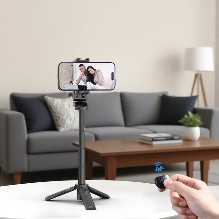 Универсальный держатель надёжно фиксирует любой смартфон, включая крупные модели с чехлами. Вес минимальный, а складная конструкция легко помещается в карман куртки или рюкзак. Может работать и как настольная подставка: для видеозвонков, онлайн-встреч или просмотра рецептов на кухне.