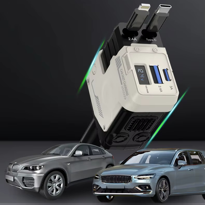 Выдвижной механизм прячет лишнее и устройство легко превращается в аккуратный блок, не занимающий место в подстаканнике. Мини-дисплей в реальном времени показывает напряжение и ток - удобно следить за состоянием сети в дальних поездках.