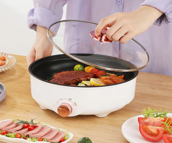 Корпус выполнен в ярком дизайне с акцентом на стильные элементы управления и прозрачную крышку, которая позволяет контролировать процесс готовки без её снятия. Кнопка-регулятор температуры даёт возможность выбрать оптимальный режим для жарки, тушения или лёгкого подогрева пищи.