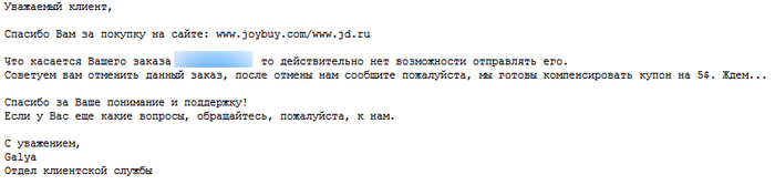 Идиллия закончилась через день когда жиды прислали грустное письмо что дескать они были не всебе и отсылать моего робота не будут. (грустный смайлик) . такие же письма счастья получили все не состоявшиеся счастливые покупатели этого чуда китайской техники. В замен обещали великодушно одарить купоном в 5 $ . Я ещё не считал но после конвертации из рублей в баксы и обратна я потеряю больше. Не считая моральной травмы.