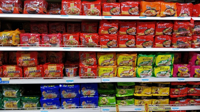 Конечно же несколько больших рядов посвящено китайской лапше. Отдельная ода лапше. В свое время хотя бы раз в 3 месяца покупал Доширак. Отвести душу. Так вот лапша в Китае после заварки как настоящий суп: наваристый, с разнообразием овощей (овощи хранятся не в сушеном виде, а в вакуумной упаковке). Не скажу, что ее едят повсеместно. Вообще за год всего пару раз видел, как ее ели. Но она очень вкусная.