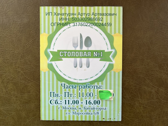 Обратите внимание, никакой вывески нет (на фотографиях в отзывах над решётчатым окном было написано крупными буквами «Столовая №1», но сейчас вывеска куда-то делась). Ориентируемся исключительно по зелёненькому постеру на открытой внешней двери.