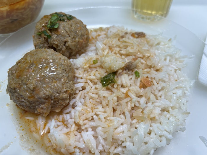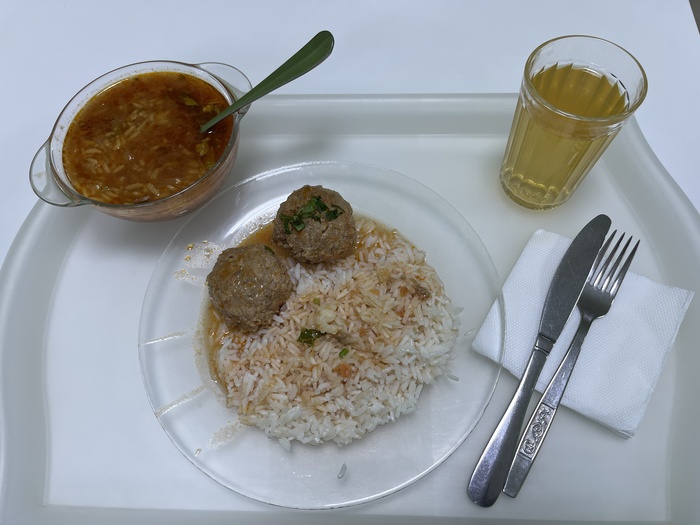 Мой выбор – суп харчо, куриные тефтельки с рисом, бледный компот из сухофруктов.