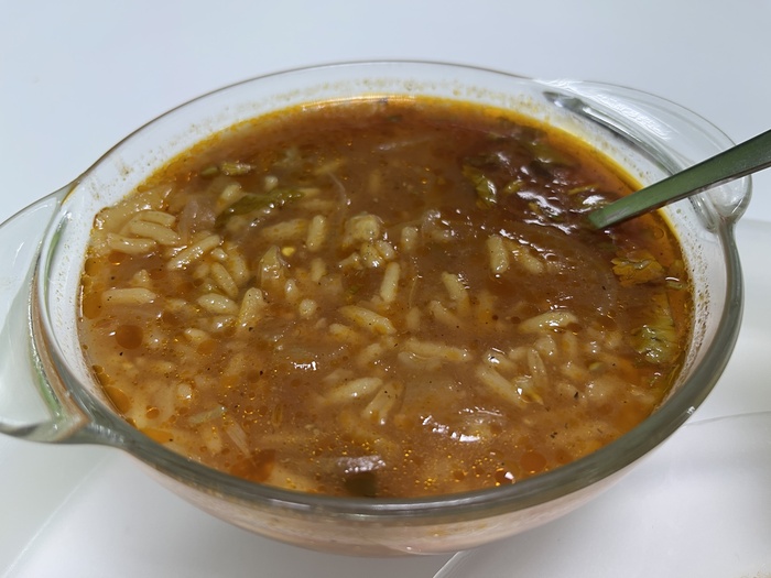 Полная порция большая. Вкус, по моему субъективному мнению, напоминает настоящий суп харчо в столовском исполнении. Впрочем, этого можно добиться и концентратом. Много риса, есть лук, много мяса – только эти кусочки мяса довольно жестковаты, не разварились даже к столь позднему часу. Но в целом суп неплох для своей ценовой категории.