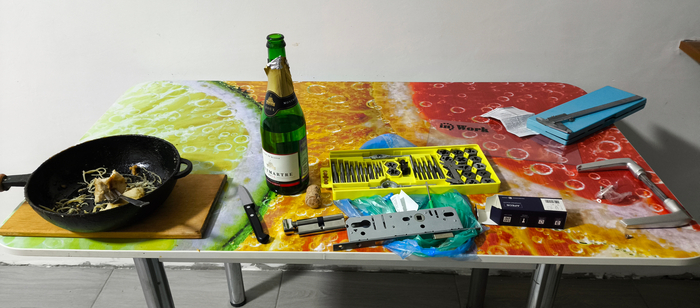 Сегодня вернулся с работы, обжарил себе спагетти с индюшатиной и внезапно заметил в бутылочнице бутылку шампуня, осталась от родственников приезжавших пару месяцев назад. Просто я пью редко и мало, и бутылка коньяка купленная в 2016м кончилась совсем недавно. А тут шампанское, у него-же срок хранения... Таким макаром и образовалась сия композиция, специально ничего не раскладывал, - всё как есть. Извините за грусть, вечер получился какой-то пьяно-поминальный.