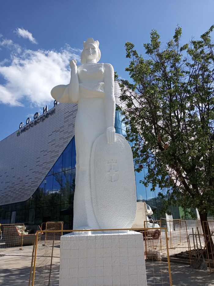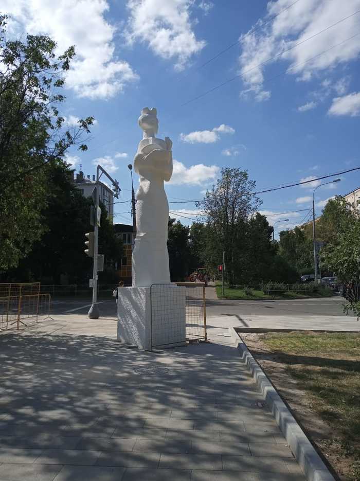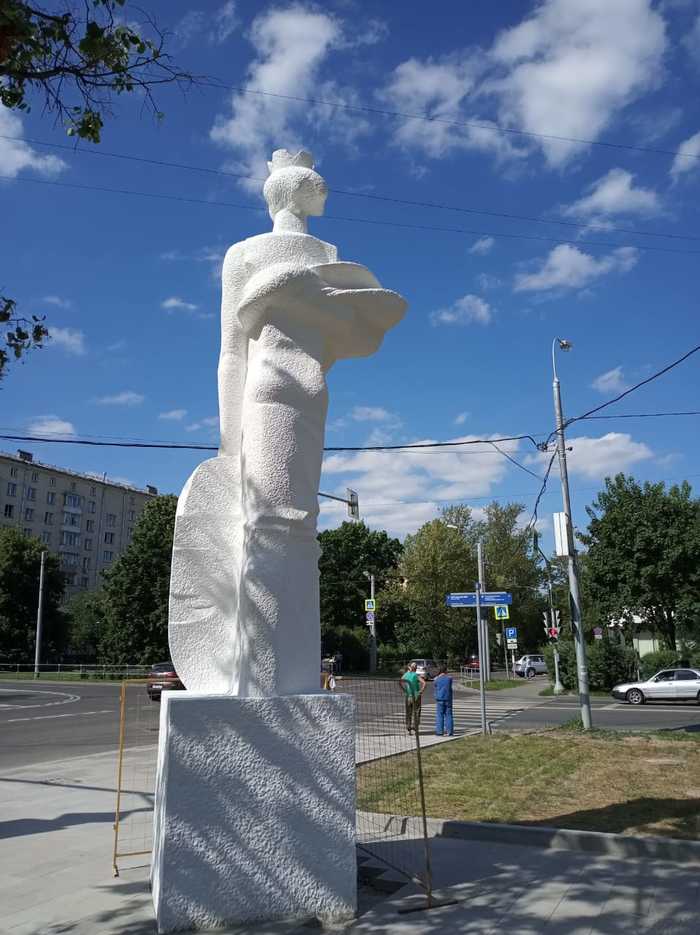 На углу 9-й Парковой и Сиреневого бульвара прямо перед пешеходным переходом вдруг возникла гигантская белая статуя. Она стоит на асфальте рядом со строящимся ТРЦ "София" почти посреди "зебры" и ошеломляет своими величественными и нелепыми гигантскими формами.