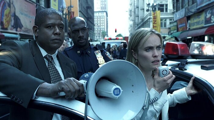 И у фильма, кстати говоря, очень приличный каст. На двух второстепенных по хронометражу, но важных по сюжету женских ролях у нас тут Рада Митчелл (которая навсегда в моём сердечке за «Кромешную тьму» и «Сайлент Хилл») в роли жены Стю и Кэти Холмс в роли его потенциальной любовницы. Полицейского детектива, который приехал на подмогу, играет как всегда классный Форест Уитакер. Он прямо с ходу создаёт впечатление грамотного оперуполномоченного, и до самого конца не совершает каких-то глупых поступков, что очень радует. Однако две ведущие роли тут, разумеется, у Колина Фаррелла и Кифера Сазерленда.
